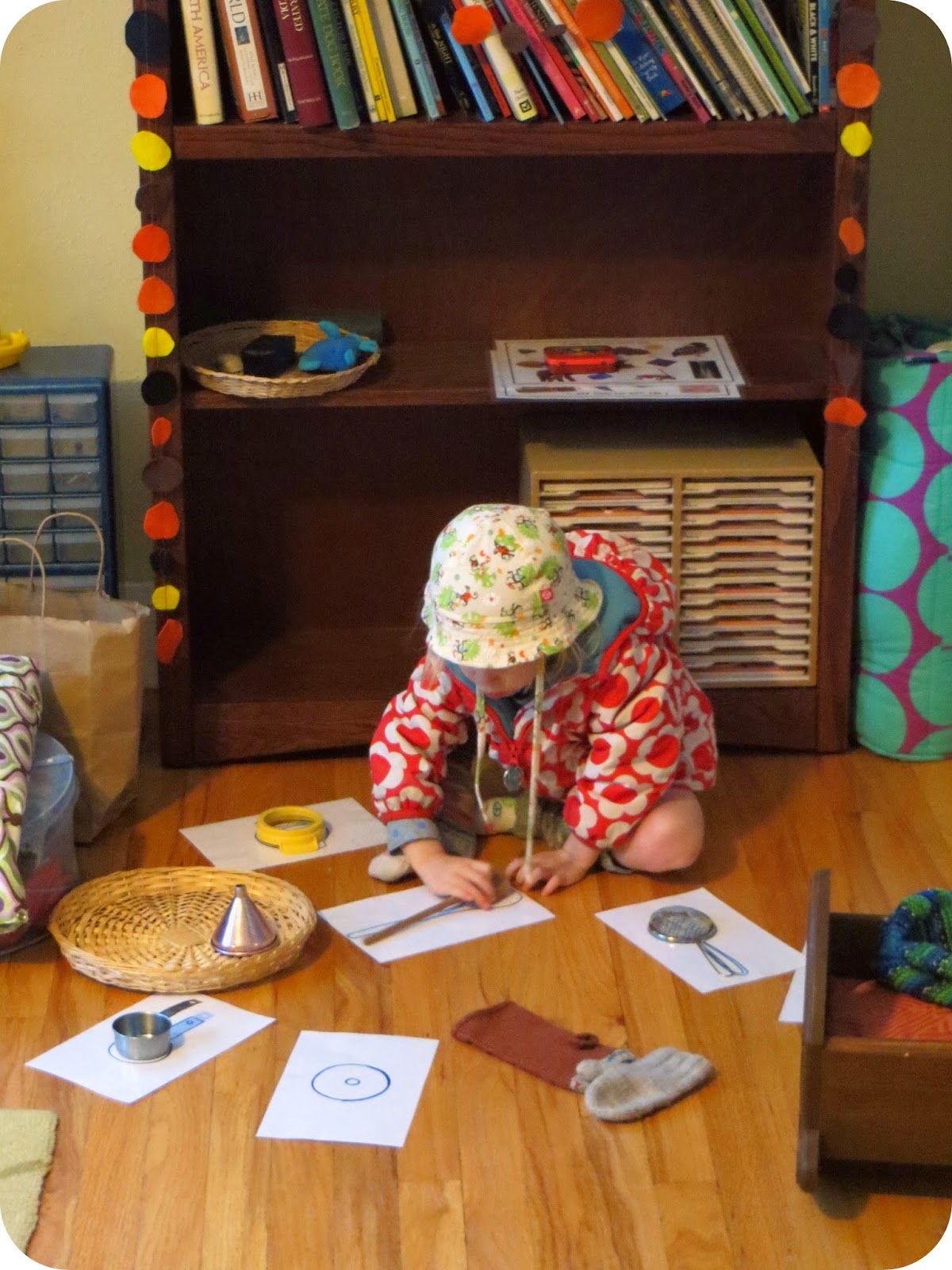 As for math and langauge (can you tell I'm running out of steam?), they're pretty straightforward for little ones. 3-year-olds are the youngest children in my classroom, and the majority of them spend most of their time in the practical life and sensorial areas of the classroom. What I would suggest for a 2-year-old is simple (please correct me here if I'm wrong!) - be conscious that you're speaking in a clear voice with real words, play "I spy" and games that involve matching, and model making a 1-1 correspondence between numbers and objects when you count things out.